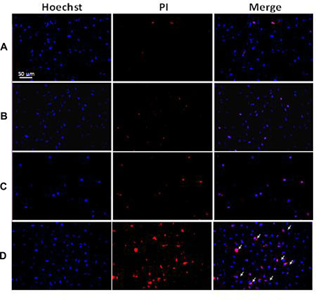 Figure 4: Double staining with Hoechst 33342 and PI on VX2 cells: (A) control, (B) cells irradiated with laser only (0.11W/cm2), (C) cells treated with Dox-Fu@AuNPs at 200 μg/ml, and (D) cells treated with Dox-Fu@AuNPs at 200 μg/ml followed by laser irradiation (0.11 W/cm2 for 2 min). Nuclei were stained with Hoechst 33342 (blue). The dead cells were represented by red staining with PI (20 × ; bar = 50 μm).