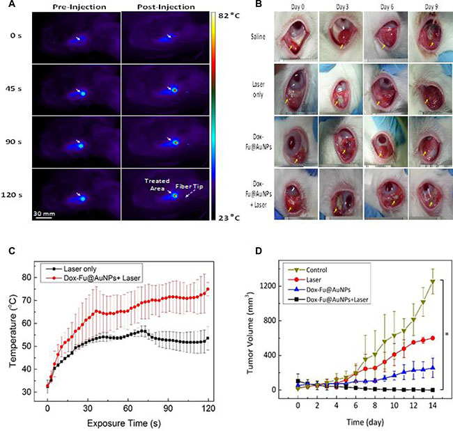 Figure 5: Chemo-photothermal effects of Dox-Fu@AuNPs in rabbit eye tumor model. (A) In vivo infrared thermographic maps of eye tumors before and after injection with Dox-Fu@AuNPs were shown at various times after laser irradiation. (B) Representative photographs of the rabbit eye tumors under various conditions (saline as control, laser only, Dox-Fu@AuNPs only, and Dox-Fu@AuNPs with laser irradiation) were shown. (C) The graph indicates temporal development of temperature from the irradiated area in the tumor during the laser irradiation (laser only vs. Dox-Fu@AuNPs with laser irradiation: N = 20). (D) Tumor volume was estimated three times per day over a period of 14 days after each treatment. (*p < 0.05 compared with control).
