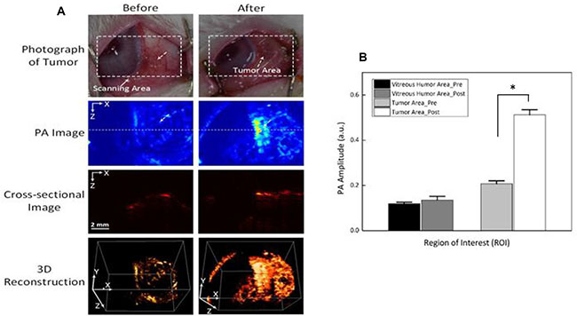 Figure 6: Photoacoustic imaging (PAI) of rabbit eye tumors injected with Dox-Fu@AuNPs. (A) Photographs of rabbit eye tumor were compared before and after Dox-Fu@AuNPs injection. (B) Photoacoustic signals from different positions in the rabbit eye tumor were compared before and after injection of Dox-Fu@AuNPs (*p < 0.05 compared with pre-injection).