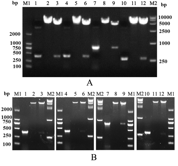 Figure 1: Construction of recombinant plasmids. (A) Identification of recombinant eukaryotic plasmids. (B) Identification of recombinant prokaryotic plasmids. M1, Trans 2K DNA marker; M2, Trans 15K DNA marker; lanes 1–3, PCR and digestion of recombinant plasmids containing IL-2 gene; lanes 4–6, PCR and digestion of recombinant plasmids containing IL-15 gene; lanes 7–9, PCR and digestion of recombinant plasmids containing IL-1β gene; lanes 10–12, PCR and digestion of recombinant plasmids containing IL-8 gene.