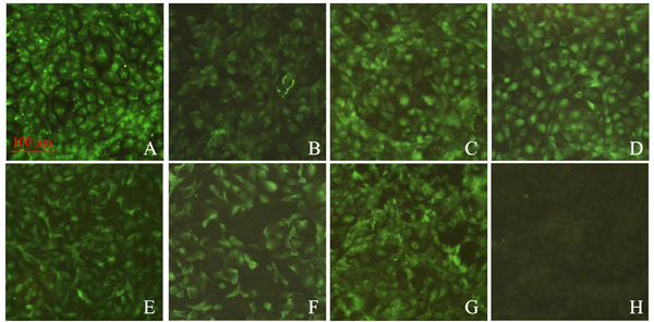 Figure 4: Immunofluorescence analysis of RTG-2 cells transfected with recombinant plasmids containing the cytokine gene. A–G. Cells were transfected with pcDNA3.1-IL-2, IL-8, IL-15, IL-17, IL-1β, iIFN1a, and IFN-γ2, respectively. Subsequently, transient expressions of proteins within cells were detected with the corresponding polyclonal antibodies. H. Cells were transfected with pcDNA3.1 empty vector, which served as negative control. The green signals reflect positive expressions of proteins of interest.