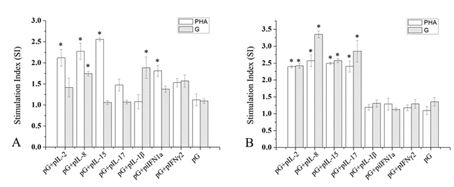 Leukocyte suspension was added in triplicate to 96-well plates. Experimental groups were incubated with the medium containing 2 μg/ml recombinant G protein. A total of 5 μg/ml PHA (Sigma, USA) was added to cultures, which were used as positive control. Negative control cells were incubated with the medium. Cell proliferation was assessed using a water-soluble tetrazolium salt-1 Cell Proliferation and Cytotoxicity Assay Kit (Beyotime, China) according to the protocol manual. Results were presented as stimulation index, which was calculated as the ratio of A450 of stimulated to that of unstimulated proliferation.