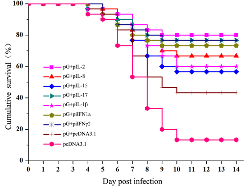 Figure 8: Survival plots for vaccinated trout after being challenged with IHNV. Fish were injected with intramuscular injection of pG alone or the combination of pG and cytokine plasmids. At 28 dpi, fish were challenged by intraperitoneal injection with 300 pfu of IHNV.