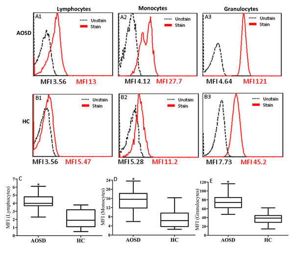 Figure 1: Representative cytometric histograms from one AOSD patient (A) and one HC (B) of Cyto-ID-staining in lymphocytes (A1 and B1), monocytes (A2 and B2), and granulocytes (A3 and B3). Comparisons of autophagosome levels of Cyto-ID-staining in lymphocytes C., monocytes D., and granulocytes E. between AOSD patients and HCs. Data are presented as box-plot diagrams, with the box encompassing the 25th percentile (lower bar) to the 75th percentile (upper bar). The horizontal line within the box indicates median value respectively for each group. *p < 0.001, vs. HC.