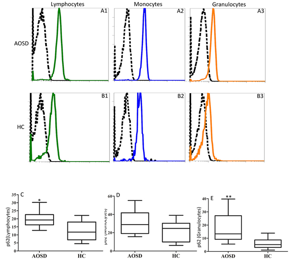 Figure 2: Representative cytometric histograms of p62 levels in lymphocytes (A1 and B1), monocytes (A2 and B2), and granulocytes (A3 and B3) from one AOSD patient A. one HC B. Comparisons of the MFI of p62 in lymphocytes C., monocytes D. and granulocytes E., between AOSD patients and HCs. Data are presented as box-plot diagrams, with the box encompassing the 25th percentile (lower bar) to the 75th percentile (upper bar). The horizontal line within the box indicates median value for each group. *p < 0.005, **p < 0.001, vs. HC.