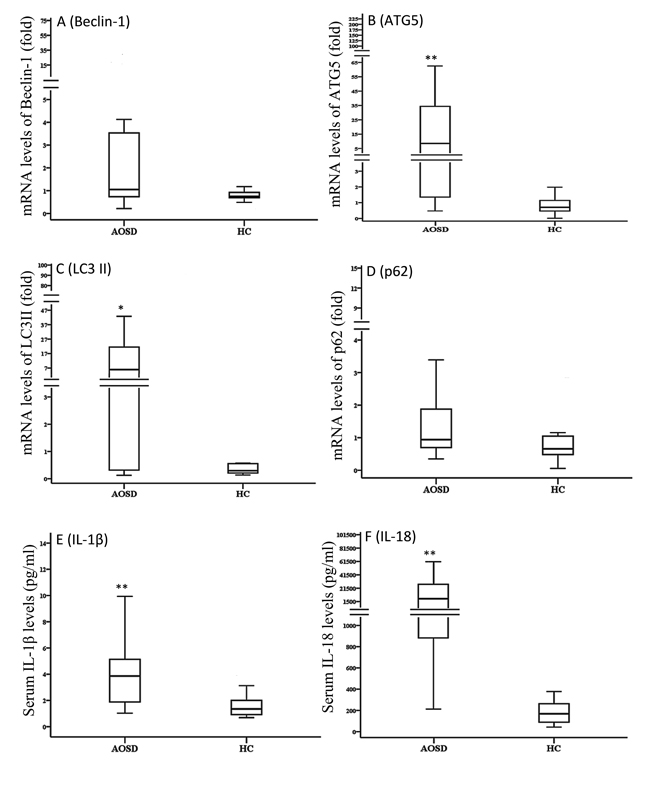 Figure 3: Comparisons of the mRNA expression levels of autophagy-related genes, including Beclin-1 A., Atg5 B., LC3-II C., and p62 D. Serum levels of IL-1β E. and IL-18 F. between AOSD patients and HCs. LC3-II: microtubule-associated protein one light chain three-II. Data are presented as box-plot diagrams, with the box encompassing the 25th percentile (lower bar) to the 75th percentile (upper bar). The horizontal line within the box indicates median value for each group. *p < 0.01, **p < 0.001, vs. HC.