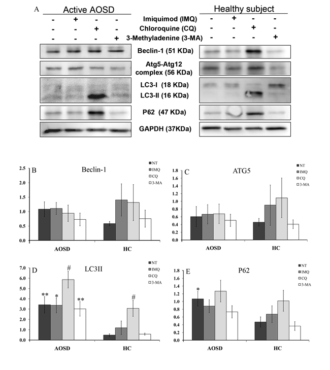 Figure 4: The effects of potential activator or inhibitor on protein expression levels of autophagy-related molecules in PBMCs. A. Representative examples of Atg protein expression in PBMC lysates treated with imiquimod, chloroquine, and 3-methyladenine in one AOSD patient and one HC. The fold change in protein levels of B. Beclin-1, C. Atg5, D. LC3-II, and p62 E. in AOSD patients and HCs. Bars and error bars indicate the mean and standard error of the mean, respectively. *p < 0.05, **p < 0.005, vs. HC; #p < 0.05, vs. no treatment group or 3-methyladenine-treated group, as determined by Mann-Whitney U test.