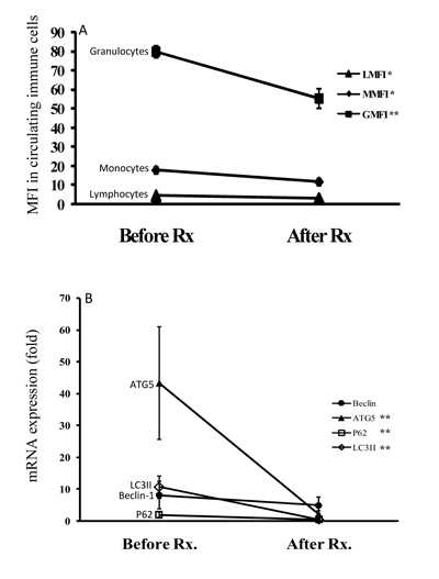 Figure 5: The changes in (A) autophagosome levels evidenced by Cyto-ID MFI in circulating immune cells and (B) the mRNA levels of autophagy-related genes including Beclin-1, Atg5, LC3-II, and p62 after 6-month therapy in AOSD patients. Data are presented as the mean ± standard error of the mean. *p < 0.05, **p < 0.01, vs. before treatment, as determined by Wilcoxon signed rank test.