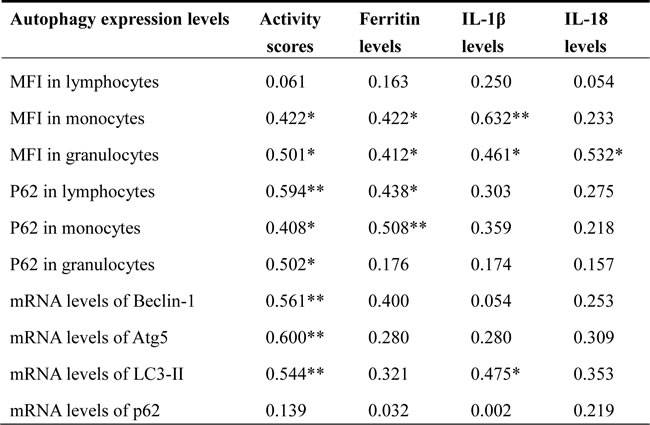 Table 1: Correlations between autophagy expression levels and disease activity parameters or serum levels of proinflammatory cytokines in 28 patients with adult-onset Still’s disease (AOSD)