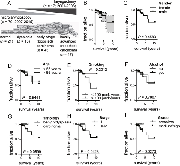 Figure 1: Study design and survival of 96 patients with benign and malignant laryngeal disease. (A) Schematic representation of patient clinicopathologic categories and their distribution across the spectrum of laryngeal neoplasia. (B) Overall Kaplan-Meier survival plot with 95% confidence interval. (C-I) Kaplan-Meier survival estimates of patients stratified by gender (C; female: n = 10; male: n = 86), age (D; ≤65 years: n=49; >65 years: n=47), smoking (E; ≤100 pack years: n= 37; >100 pack years: n= 59), alcohol (F; no: n= 48; yes: n= 48), clinicopathologic category (G; benign/dysplasia: n = 36; carcinoma: n = 60), TNM7 stage (H; I: n = 55; II-IV: n = 41), and tumor grade (I; none/low: n = 47; medium/high: n = 49). n, sample size; P, probability by log-rank test.