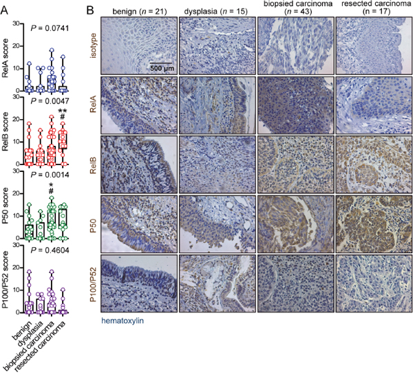 Figure 2: Immunohistochemical detection of NF-κB subunit expression by clinicopathologic study group. (A) Data summary shown as raw data points and bars (median) with boxes (interquartile range) and whiskers (95% percentiles). (B) Representative images.n, sample size; P, overall probability by Kruskal-Wallis test. * and **: P< 0.05 and P< 0.01, respectively, for comparison with benign group by Dunn’s post- tests. #: P< 0.05 for comparison with dysplasia group by Dunn’s post-tests.