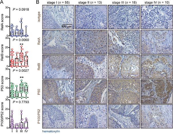 Figure 3: NF-κB subunit expression by TNM7 stage. (A) Data summary shown as raw data points and bars (median) with boxes (interquartile range) and whiskers (95% percentiles). (B) Representative images.n, sample size; P, overall probability by Kruskal-Wallis test. **: P< 0.01 for comparison with benign group by Dunn’s post-tests.