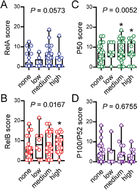 Figure 4: Immunohistochemical detection of NF-κB subunit expression by tumor grade. Data summary shown as raw data points and bars (median) with boxes (interquartile range) and whiskers (95% percentiles). n = 39, 8, 31, and 18, respectively, for none (not applicable or specified), low, intermediate, and high grade groups. P, overall probability by Kruskal-Wallis test. *: P< 0.05 for comparison with benign group by Dunn’s post-tests.