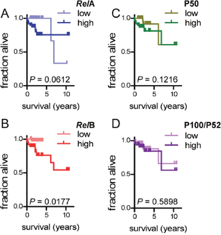 Figure 5: Survival by NF-κB subunit expression. Shown are Kaplan-Meier survival estimates of patients dichotomized by median NF-κB subunit expression score (n = 48/group for all groups and graphs). n, sample size; P, probability by log-rank test.