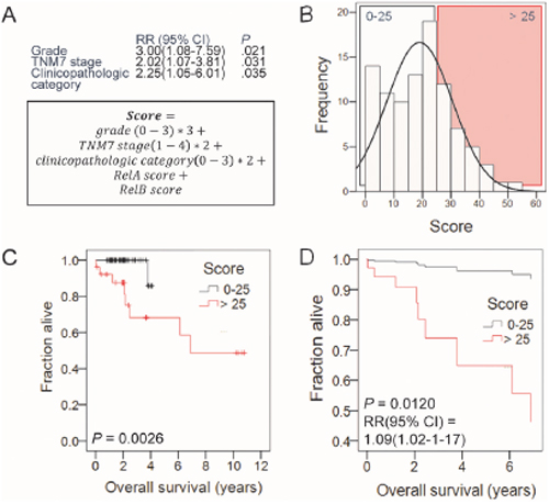 In order to define a potential role for NF-κB subunit expression in predicting survival, we dichotomized our study cohort into low and high expression groups by the median value for each subunit (always n = 48/group). Interestingly, we found no significant differences in survival between patient groups expressing different levels of RelA, P100/P52, and P50 (Figure 5A, 5C, 5D). However, patients with high RelB expression displayed statistically significant shorter survival compared with patients with low RelB expression (Figure 5B). We next entered all clinical variables and NF-κB subunit expression group (low or high for each different subunit) into Cox regression analysis using survival as the end-point and the Waldman backward elimination method (Figure 6). Tumor grade emerged as the only independent predictor of survival, suggesting that tumor stage, local extent necessitating intervention, and RelB expression are interconnected predictors of survival in laryngeal cancer. When tumor grade was eliminated, TNM7 stage emerged as an independent predictor of survival, and when TNM7 stage was eliminated, clinicopathologic category significantly predicted survival (Figure 6A; Table). We extracted proportional hazards ratios from these analyses and combined them with RelA and RelB scores (which marginally and significantly predicted survival in Kaplan-Meier analyses shown in Figure 5) to form a proportional laryngeal cancer prognostic score (Figure 6A; equation). Based on the distribution of patients according to the new score, they were dichotomized using a cut-off of 25 (Figure 6B). The newly devised laryngeal cancer prognostic score accurately and significantly predicted survival on Kaplan-Meier and Cox proportional hazards analyses, indicating that NF-κB subunit expression cooperates with clinical grade, stage, and extent to define survival (Figure 6C and 6D).
