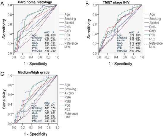 In order to better define the association between clinicopathologic variables and NF-κB expression with tumor progression, we performed ROC analyses. As shown in Figure 7, increasing age, smoking exposure, and RelB and P50 expression were statistically significantly and positively associated with tumor extent, stage, and grade (Figure 7A-7C). However, we failed to identify such relationships for alcohol consumption and RelA and P100/P52 expression (Figure 7A-7C).
