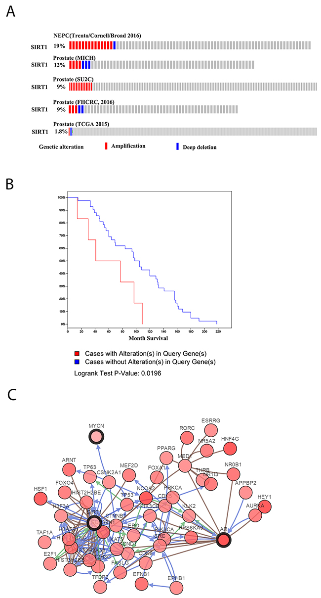 Figure 1: SIRT1 expression levels in Pca as recorded in TCGA database. (A) SIRT1 expression in some published Pca datasets, including Neuroendocrine Prostate Cancer (Trento/Cornell/Broad 2016) [18], Prostate (MICH) [20], Prostate (SU2C) [19], Prostate (FHCRC, 2016) [54], and Prostate (TCGA 2015) [55]. (B) Survival analysis of Pca patients with SIRT1 in the dataset Prostate Adenocarcinoma, Metastatic (Michigan, Nature 2012) [20]. (C) Pathway analysis of SIRT1 in Pca based on the dataset Neuroendocrine Prostate Cancer (Trento/Cornell/Broad 2016) [18].