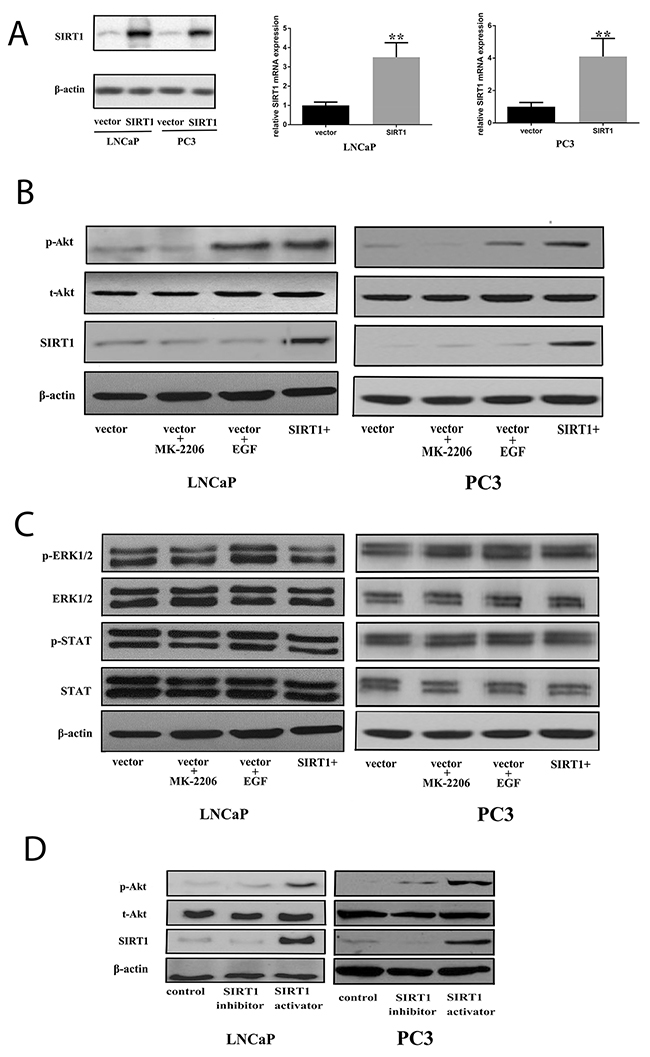 Figure 4: Increased expression of SIRT1 can activate the Akt pathway. (A) Pca cells (LNCaP and PC3) were transfected with an empty vector or one encoding SIRT1. After 36 h of transfection, cell pellets were lysed and prepared for real-time qPCR analysis or western blot analysis using specific antibodies. Three independent experiments were performed by real-time qPCR, and the data are presented as the mean±SD (columns, mean of three different experiments; bars, SD). *: p<0.05; **: p<0.01, by Student’s t-test. (B) Akt was phosphorylated and activated in Pca cells after transfection with SIRT1 for 3 days. Expression of phospho-Akt increased in cells with SIRT1 overexpression as well as cells treated with the positive control EGF (an Akt activator, 20 ng/ml), while increased phospho-Akt was not found in cells transfected with the vector or in cells transfected with the vector and treated with the negative control MK2206 (a phospho-Akt inhibitor, 10 μM). (C) There was no statistically significant change in ERK1/2 or STAT activation in cells with SIRT1 overexpression. (D) Akt was phosphorylated and activated in Pca cells after 3 days of treatment with a SIRT1 activator. p-Akt: phospho-Akt; t-Akt: total Akt; vector: transfection with vector only; vector + MK2206, cells transfected with vector and treated with MK2206; vector + EGF, cells transfected with vector and treated with EGF; SIRT1+: transfection with SIRT1; SIRT1 activator: SRT1720; SIRT1 inhibitor: ex527.