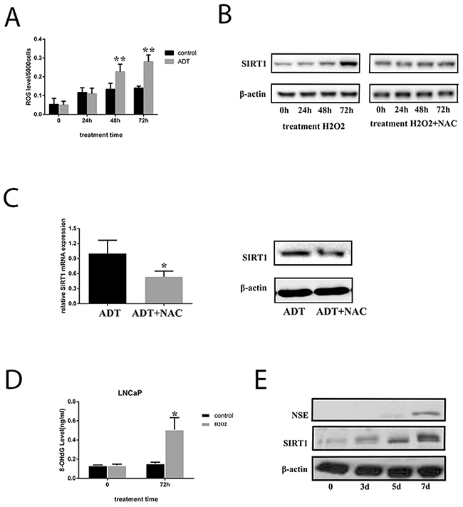 Figure 6: ADT increased SIRT1 expression by inducing ROS levels in LNCaP cells. (A) ROS levels in LNCaP cells increased in a time-dependent manner under ADT. In each group (control or ADT), all the ROS levels were compared with the value before treatment (time point 0). (B) SIRT1 expression in the cells increased in a time-dependent manner with H2O2 treatment, and the upregulation of SIRT1 expression can be blocked by NAC. (C) Both mRNA (left) and protein (right) expression of SIRT1 was inhibited in LNCaP cells under ADT combined with NAC. Cells were cultured under ADT alone or in combination with NAC for 3 days, after which cells were collected. Three independent experiments were performed by real-time qPCR, and data are presented as the mean±SD (columns, mean of three different experiments; bars, SD). *: p<0.05; **: p<0.01, by Student’s t-test. (D) The 8-OHdG levels were measured after LNCaP cells were cultured under ADT for 72 h. Columns, mean of three different experiments; bars, SD. ADT treatment significantly increased 8-OHdG levels (*, p < 0.05 by Student’s t-test). (E) ROS promoted both SIRT1 and NSE expression in LNCaP cells. The cells were treated with H2O2 for the indicated period, and then, the cell pellets were lysed and prepared for western blot analysis with specific antibodies. The results indicated that NSE levels increased after LNCaP cells were treated with H2O2 for 7 days.