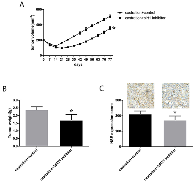 We also investigated the effect of SIRT1 expression in vivo. Eight-week-old male nude mice were subcutaneously injected with neuroendocrine-transformed LNCaP cells, and then, tumor volumes were monitored every 3 days. Surgical castration was performed when the tumor volume reached 200 mm3, followed by treatment with the SIRT1 inhibitor ex527, and further growth of the tumors was monitored. Castration resulted in a significant regression of the tumors, from more than 200 mm3 to 100 mm3 two weeks after castration, and then, the tumors started to regrow. Overall, we found that in the group of mice subjected to castration and ex527, tumor growth was much slower than in the control groups (p=0.014, see in Figure 7), and tumor weight was much lower in mice with SIRT1 inhibitor treatment. Moreover, we investigated the expression of NSE in tumors, and the results showed that the NSE expression level was much lower in mice treated with the SIRT1 inhibitor.