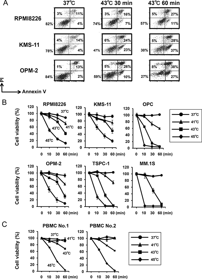 Figure 1: Hyperthermia induces MM cell death. (A) RPMI8226, KMS-11 and OPM-2 cells were cultured at 37 or 43°C for the indicated time periods. After the heat treatment, the MM cells were further cultured at 37°C for 24 hours. The cells were stained with annexin V-FITC and propidium iodide (PI), and then analyzed by flow cytometry. (B) MM cell lines were cultured at 37, 41, 43 or 45°C for 10, 30 and 60 minutes. After the heat treatment, the MM cells were further cultured at 37°C for 24 hours. Cell viability was then analyzed by a WST-8 assay. (C) PBMCs from two normal donors were cultured at 37, 41, 43 or 45°C for 10, 30 and 60 minutes. Cell viability was then analyzed by a WST-8 assay.