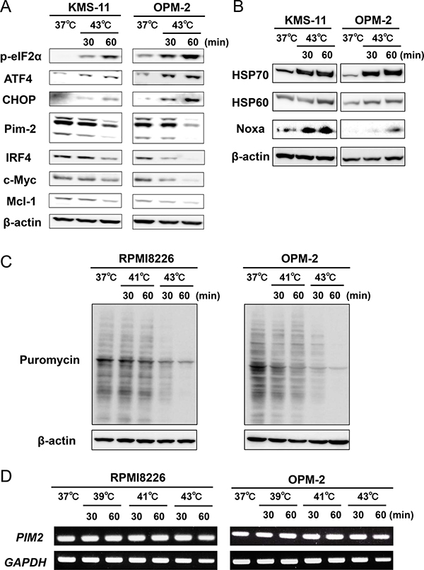 Figure 2: Hyperthermia induces ER stress along with the downregulation of IRF4, Pim-2, c-Myc and Mcl-1 in MM cells. (A) KMS-11 and OPM-2 cells were cultured at 37 or 43°C for the indicated time periods. The cells were harvested, and the protein levels of phosphorylated eIF2α (p-eIF2α), ATF4, CHOP, IRF4, Pim-2, c-Myc and Mcl-1 were analyzed by Western blotting. β-actin was used as a protein loading control. (B) KMS-11 and OPM-2 cells were cultured at 37 or 43°C for the indicated time periods. The cells were harvested, and the protein levels of HSP70, HSP60 and Noxa were analyzed by Western blotting. β-actin was used as a protein loading control. (C) Puromycin incorporation. RPMI8226 and OPM-2 cells were treated with hyperthermia at 41 or 43°C for the indicated time periods. Puromycin was added at 1 μM for the last 15 minutes of the hyperthermia. The cells were harvested, and their puromycin incorporation was examined by Western blot analysis. β-actin was blotted as a loading control. (D) RPMI8226 and OPM-2 cells were treated with hyperthermia at 39 or 41 or 43°C for the indicated time periods. Then, the cells were incubated at 37°C for 6 hours. PIM2 mRNA expression was determined by RT-PCR. GAPDH mRNA was used as an internal control.