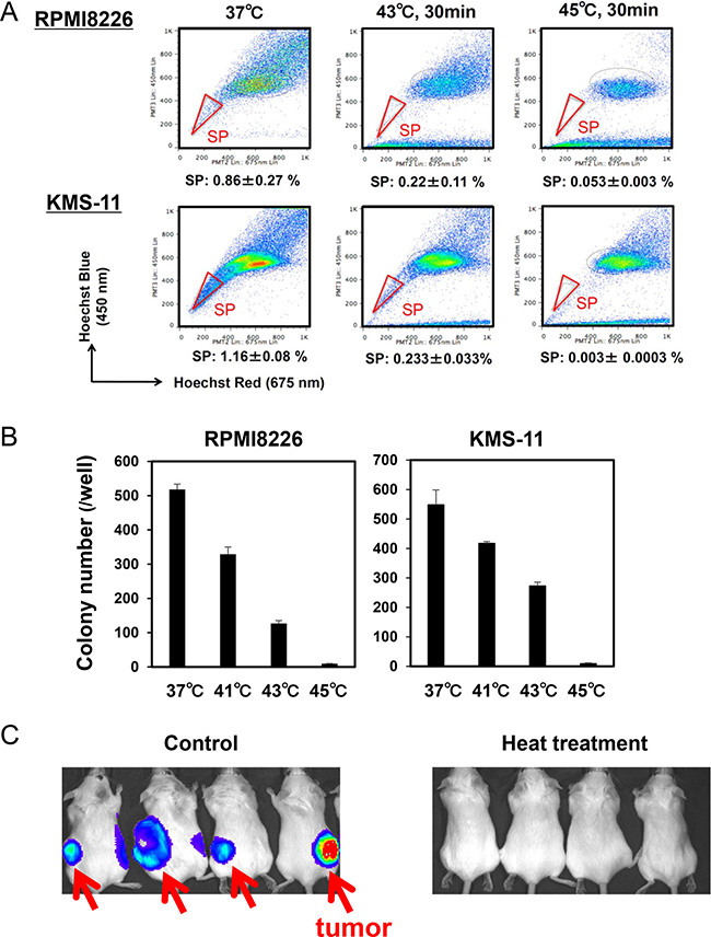 Figure 4: Hyperthermia impairs clonogenic MM cells. (A) RPMI8226 and KMS-11 cells were cultured at 37, 43 or 45°C for 30 minutes. The cells were subsequently cultured at 37°C for 24 hours, and % distributions of SP fractions were determined by flow cytometry. (B) RPMI8226 and KMS-11 cells were cultured at 37, 41, 43 and 45°C for 30 minutes, and then subjected to methylcellulose assay. After culturing for 14 days, colony numbers were counted. (C) pGL4-transfected RPMI8226 were cultured at 37 or 43°C for 30 minutes, and then the MM cells were subcutaneously transplanted into SCID mice. The MM tumors were visualized at 6 weeks after the inoculation.