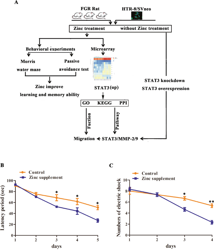 Our previous study showed that FGR can affect the regular development of fetal brain, and it can also damage the early and long-term spatial learning ability of neonates, plus the close association of FGR with the dysfunction of the central nervous system, leading to the abnormal behavior of FGR kids [3]. Recently, there is considerable evidence to support that learning and memory abilities impairment of FGR rats associated with placenta, especially for the deficiency of trophoblast cell invasion and migration [1]. In the present study we firstly showed that zinc supplement improved memory and learning abilities of FGR rats, and increased the abilities of invasion and migration of trophoblast cells. Moreover, the expression level of STAT3 was obviously up-regulated after zinc treatment, and promotes cell invasion and migration via increasing the expression level of MMP-2/9. We provide evidence that zinc improves learning and memory abilities of FGR rat via promoting trophoblast cell invasion mediated by STAT3-MMP-2/9 axis.