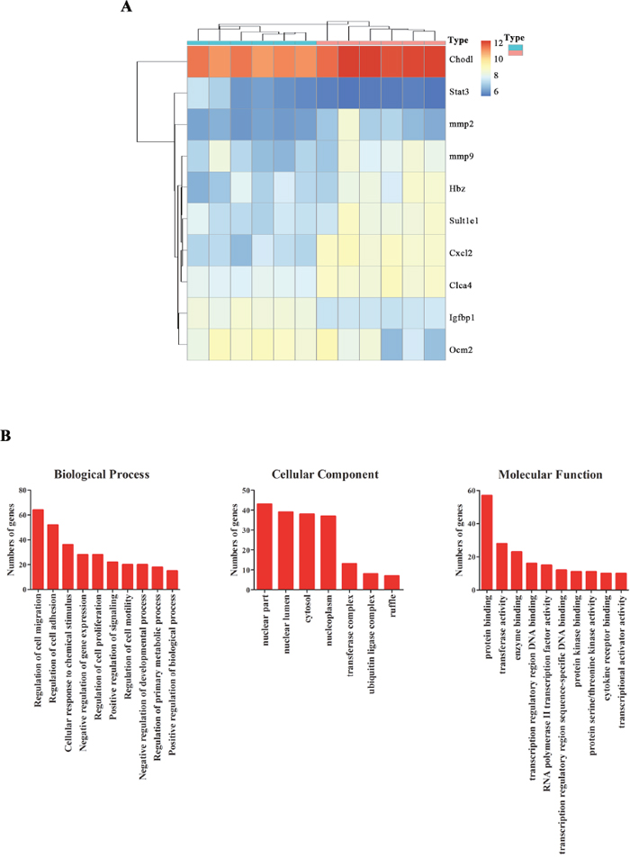 Figure 2: Differentially expressed genes and functions in placenta tissues with and without zinc supplementation. (A) Heat map of differentially expressed mRNAs in placenta tissues with and without zinc supplementation(Blue stands for without zinc supplementation group; Red stands for with zinc supplementation group). (B) Gene ontology(GO) analysis of these differentially expressed genes.