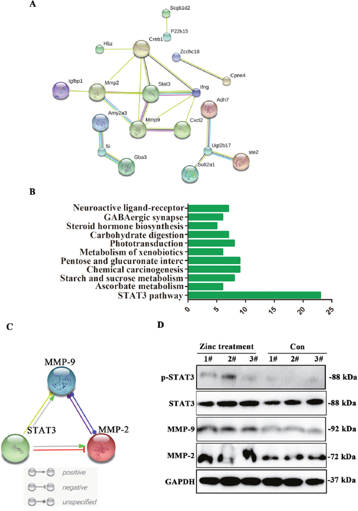 Figure 3: The expression level of STAT3-MMP-2/9 were upregulated after zinc supplementation. (A) Protein-protein interaction of main dysregulated genes. (B) KEGG analysis of main dysregulated genes. (C) The interaction was existed among STAT3, MMP-2 and MMP-9. (D) The expression levels of STAT3, phosho-STAT3, MMP-2 and MMP-9 were obviously upregulated in placenta tissues after zinc supplementation.