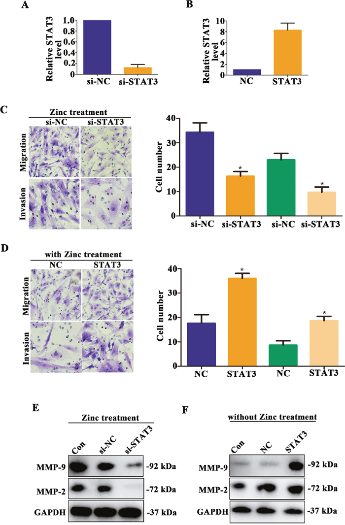 Figure 5: Zinc promotes HTR-8/SVneo cells migration and invasion mediated by STAT3. (A-B) The relative STAT3 mRNA level was detected by qRT-PCR. (C) After zinc treatment, Transwell assay was used to assess the abilities of migration and invasion in HTR-8/SVneo cells knocked down STAT3. (D) Transwell assay was used to assess the abilities of migration and invasion in HTR-8/SVneo cells overexpressed STAT3. (E) In zinc treatment group, the expression level of MMP-2 and MMP-9 was detected in HTR-8/SVneo cells knocked down STAT3. (F) In non-zinc treatment group, the expression level of MMP-2 and MMP-9 was detected in HTR-8/SVneo cells overexpressed STAT3.