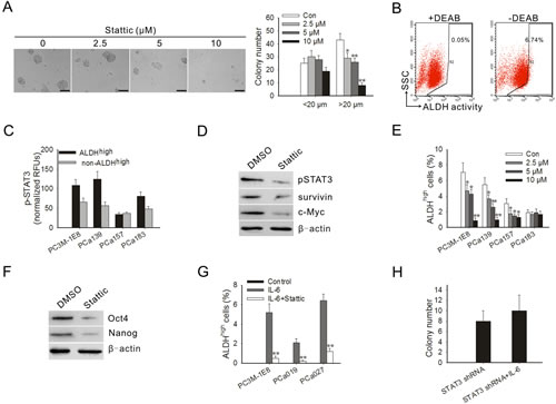 Figure 3: Blocking STAT3 activation inhibited anchorage-independent growth of PC3M-1E8 cells, decreased the proportion of ALDHhigh cells and blocked the conversion of non-ALDHhigh cells to ALDHhigh cells mediated by IL-6. (A) Representative images of soft agar assay (left panel). Quantitation of colonies from soft agar assay of PC3M-1E8 cells treated with Stattic (right panel). (B) PC3M-1E8 cells were subjected to ALDEFLUORH assay in order to identify cells with high ALDH expression (ALDHhigh). The ALDH inhibitor DEAB was used as a negative control (left panel). The cells without inhibitor shifted to the right were considered ALDHhigh cells (right panel). (C) ELISA for pSTAT3 in ALDHhigh subpopulations and non-ALDHhigh subpopulations derived from PC3M-1E8 cells and primary prostate cancer cells. (D) Western blot analysis of ALDHhigh cells derived from PC3M-1E8 cells treated with 10 μM Stattic for 4 h. (E) Stattic significantly decreased the proportion of ALDHhigh prostate cancer cells in vitro. (F) Western blot analysis of PC3M-1E8 cells treated with 10 μM Stattic for 4 h. (G) Number of ALDHhigh cells formed from non-ALDHhigh cells obtained by sorting PC3M-1E8 cells and primary prostate cancer cells upon treatment with IL-6 in the presence or absence of Stattic. (H) Colony formation ability of STAT3 knock-down PC3M-1E8 cells treated with 25 ng/ml IL-6. Quantitation of colonies that were at least 20 μm in diameter was recorded. *P < 0.05, **P<0.01.