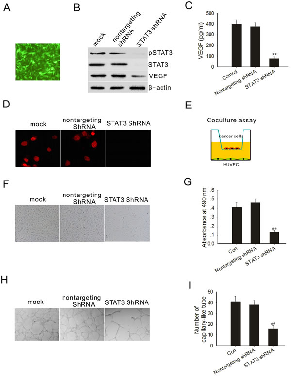 Angiogenesis is critical to tumor formation and maintenance [25]. We first determined whether STAT3 was required for VEGF expression in PC3M-1E8 cells. We knocked down STAT3 by RNA interference using a dicistronic lentivirus shRNA delivery system as previously described [26]. After exposure of PC3M-1E8 cells to the lentivirus encoding shRNA of STAT3 and GFP, most of the cells expressed GFP 72 hours after the infection (Fig. 4A). Cell sorting was carried out by selecting cells expressing the GFP marker at 72 hours postinfection. As shown in Fig. 4B, STAT3 and pSTAT3 protein expression were virtually depleted from the PC3M-1E8 cells after STAT3 shRNA transduction and its target protein VEGF was significantly reduced (Fig. 4B and C). In contrast, STAT3 and pSTAT3 expression were not affected by the nontargeting shRNA lentivirus (Fig. 4B). Immunofluorescence also showed that STAT3 shRNA lentivirus infected cells did not show pSTAT3 in the nucleus (Fig. 4D).