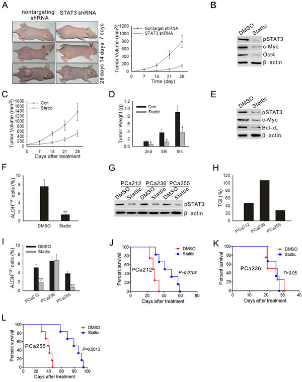 Next, we further analyzed the effect of Stattic on tumor growth in PDTX models. The ALDHhigh subpopulations in three patient-derived xenografts were detectable to various extents (Supplementary Table S2). However, within a given patient xenograft lineage, the relative percentage of ALDHhigh subpopulation remained conserved through F1 to F3 passages in mice (Supplementary Table S2), suggesting that the xeno-trans-plantation process did not affect ALDH expression. Western blotting of tumor lysates showed that high pSTAT3 protein levels were found in all patient-derived F3 xenografts (Fig. 5G). To determine the extent of pSTAT3 inhibition by Stattic in the three individual patient-derived tumors, Western blot analysis of pSTAT3 in xenograft tumors was performed at the end of the experiments. As shown in Fig. 5H, in vivo treatment with Stattic greatly decreased the levels of pSTAT3 protein in the three individual patient-derived tumors. Treatment with Stattic resulted in a significant decrease in tumor volume in PCa212 and PCa255 xenografts, the TGI varied from 47% to 28% (Fig. 5H), and the percentage of ALDHhigh subpopulation in the two tumors was also reduced significantly (Fig. 5I). Kaplan-Meier curves showed the increase in survival of mice bearing PCa212 and PCa255 xenografts treated with Stattic (Fig. 5J-L).