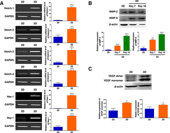 Activation of the Notch signaling pathway, playing central roles in proliferation and progression of a variety of tumor cell types including lymphoma, was evaluated by RT-PCR to further explore the molecular mechanism by which the 3D microenvironment in AmCA hydrogels regulates tumor aggressiveness in lymphoma cells. As shown in Figure 3A, EL4 cells after 3D culture for 10 days in AmCA hydrogels expressed strikingly elevated gene transcript levels of Notch-1, -2, -3, and -4 (18.6-fold, 2.2-fold, 6.5-fold, and 5.4-fold, respectively) as well as Hes-1 and Hey-1 (58.3-fold and 4.0-fold, respectively), compared to the 2D controls. To explore the molecular mechanism by which the 3D microenvironment in AmCA hydrogels regulates malignancy in lymphoma cells, the expression levels of MMP and VEGF, critical molecules in tumor cell metastasis and angiogenesis, was determined by western blotting. As shown in Figure 3B, EL4 cells after 3D culture for 7 or 10 days in AmCA hydrogels exhibited strongly enhanced expression of MMP-2 (5.3-fold and 16.1-fold, respectively) and MMP-9 (2.9-fold and 4.5-fold, respectively). Additionally, EL4 cells after 3D culture for 10 days in AmCA hydrogels expressed robustly augmented expression of VEGF proteins (2.0-fold for the monomer and 1.4-fold for the dimer) compared to the 2D controls (Figure 3C).