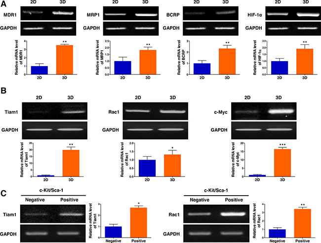 Figure 5: 3D microenvironment in AmCA hydrogels elevates the expression of multidrug resistance-related genes in 3D lymphoma spheroids compared to their 2D cultures. (A) RT-PCR demonstrates upregulated expression of MDR1, MRP1, BCRP, and HIF-1α genes important in promoting malignancy and multidrug resistance in 3D spheroids compared to 2D culture. Bar graphs depict densitometry quantitation of MDR1, MRP1, BCRP, and HIF-1α mRNA expression normalized to GAPDH mRNA. (B) RT-PCR demonstrates upregulated expression of Tiam1, Rac1, and c-Myc genes important in tumor progression and chemoresistance in 3D spheroids compared to 2D culture. Bar graphs depict densitometry quantitation of Tiam1, Rac1, and c-Myc mRNA expression normalized to GAPDH mRNA. (C) RT-PCR analysis of EL4 cells for the expression of Tiam1 and Rac1 genes by c-Kit+/Sca-1+ stem cells and c-Kit-/Sca-1- non-stem cells. Bar graphs depict densitometry quantitation of Tiam1 and Rac1 mRNA expression normalized to GAPDH mRNA. Data represent the means ± SD of three independent experiments. *P < 0.05, **P < 0.01, and ***P < 0.001 versus the control.