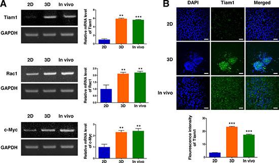 Figure 6: Expression of Tiam1, Rac1, and c-Myc in 2D- and 3D-cultured EL4 cells and their in vivo tumor tissue. (A) RT-PCR demonstrates upregulated expression of Tiam1, Rac1, and c-Myc genes in 3D spheroids compared to 2D culture. EL4 cells expressed higher levels of Tiam1 in the 3D culture and fresh EL4 tumor than in the 2D culture, with no significant difference in the expression level of Tiam1/Rac1 between the 3D culture and fresh in vivo tumor. Bar graphs depict densitometry quantitation of Tiam1, Rac1, and c-Myc mRNA expression normalized to GAPDH mRNA. (B) Immunofluorescence images also show that EL4 cells expressed higher levels of Tiam1 in the 3D culture and fresh EL4 tumor than in 2D culture. The Tiam1 staining intensities were measured using ImageJ software. Data represent the means ± SD of three independent experiments. Scale bar, 40 μm. *P < 0.05, **P < 0.01, and ***P < 0.001 versus the control.