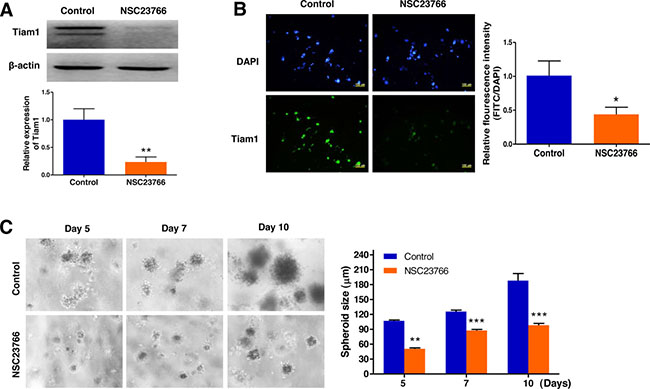 Figure 7: Repression of Tiam1 expression prevents cell growth in 3D lymphoma spheroids. (A) Western blot and (B) immunofluorescence microscopy demonstrates the strong inhibition of Tiam1 expression by NSC23766 in 3D spheroids. (C) Phase contrast microscopy demonstrates a marked reduction in the size of EL4 cell spheroids by inhibition of endogenous Tiam1. Data represent the means ± SD of three independent experiments. *P < 0.05, **P < 0.01, and ***P < 0.001 versus the control.