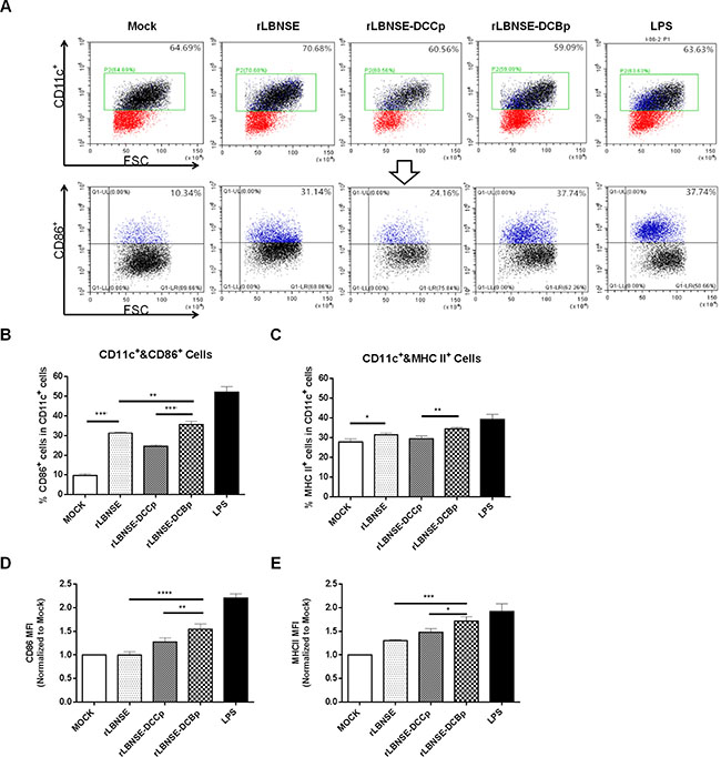 To investigate if insertion of DCBp targets, binds and finally activates DCs in vitro, DCs were prepared from mouse bone marrow, and the purity checked by FACS were about 90% (data not shown). Then the prepared DCs were incubated with each rRABV, and lipopolysaccharide (LPS) was used as a positive control. A representative gating strategy of DCs (CD11c+ and CD86+) was as shown in Figure 2A. As expected, significantly higher percentage of CD86+ (Figure 2B) or MHC II+ (Figure 2C) cells in CD11c+ cells were detected in cells incubated with rLBNSE-DCBp or rLBNSE than those incubated with rLBNSE-DCCp or DMEM (mock). In addition, significantly more activated DCs (CD11c+ and CD86+) were observed in rLBNSE-DCBp incubated cells than those incubated with rLBNSE (Figure 2B). Furthermore, to evaluate differences in the levels of CD86 and MHC II expression within the total activated DC population, mean fluorescence intensities (MFI) were calculated among cells incubated with different rRABVs by normalizing to those in mock infected cells. As shown in Figure 2D and 2E, both the MFI of CD86 and MHC IIwere significantly higher in cells incubated with rLBNSE-DCBp than those incubated with rLBNSE or rLBNSE-DCCp. Overall, rLBNSE-DCBp could activate significantly more DCs than rLBNSE-DCCp or rLBNSE in vitro.