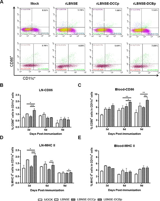 To examine whether rLBNSE-DCBp could activate more DCs in vivo, groups of BALB/c mice ( n = 5) were immunized with 106 FFU rRABV or mock immunized with DMEM by intramuscular (i.m.) route. Blood and inguinal lymph nodes were collected at 3, 6 and 9 days post-immunization (dpi), and single cell suspension was prepared for the detection of activated DCs (CD11c+ and CD86+ or MHC II+) via flow cytometry. The representative gating strategy for activated DCs (CD11c+ and CD86+) from blood or lymph nodes was shown in Figure 3A. Significantly more CD11c+ and CD86+ DCs were detected in lymph nodes of mice immunized with rLBNSE-DCBp than those immunized with rLBNSE-DCCp or rLBNSE at 3 dpi (Figure 3B), while the significant more CD11c+ and CD86+ DCs were observed at 6 and 9 dpi in the blood (Figure 3C). In addition, significantly more CD11c+ and MHC II+ DCs were found in lymph nodes of mice immunized with rLBNSE-DCBp than those immunized with rLBNSE-DCCp or rLBNSE at 3 dpi (Figure 3D), while no significant difference was detected in the blood (Figure 3E). The above data illustrates that rLBNSE-DCBp could recruit more DCs both in the blood and inguinal lymph nodes in immunized mice than the parent virus.