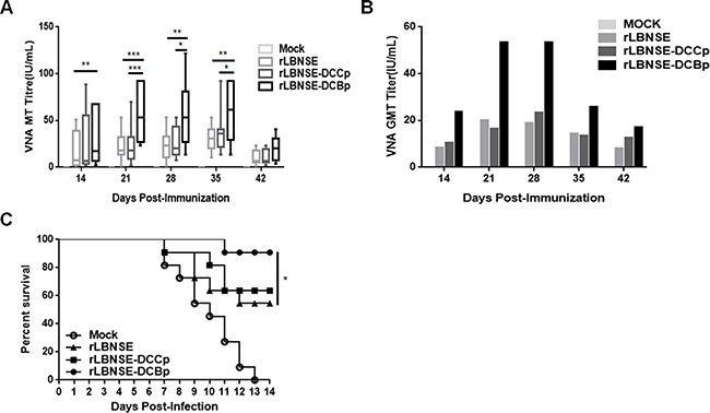 Figure 5: VNA production and survivorship after immunization with different rRABVs in mice. Groups of ICR mice (n = 10) were immunized with 1 × 106 FFU of rLBNSE, rLBNSE-DCCp, rLBNSE-DCBp or mock immunized with the same volume of DMEM by the i.m. route. At indicated time points, blood samples were collected and sera were separated for VNA test by FAVN. (A) and (B) The VNA titers and VNA geometric mean titers (GMT) determined at different indicated time points in mice immunized with different rRABVs. (C) Survivorship of mice immunized with different rRABVs. At 21 dpi, mice were challenged i.c. with 50 × LD50 of CVS-24 and observed twice a day for 21 days, and the numbers of survivors were recorded. Data are the means from three independent experiments (*P < 0.05; **P < 0.01; ***P < 0.001).