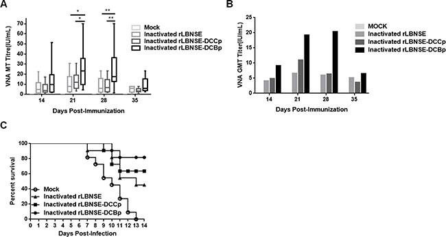 Figure 6: The efficiency used as inactivated vaccines in mice. Groups of ICR mice (n = 10) were immunized i.m. with 1 × 107 FFU of inactivated rLBNSE, rLBNSE-DCCp, rLBNSE-DCBp or the same volume of DMEM (mock). At indicated time points, blood samples were collected and sera were separated for VNA test by FAVN. (A) and (B) The VNA titers and VNA geometric mean titers (GMT) were determined at different indicated time points. (C) Survival ratio of mice immunized with different rRABVs. At 21 dpi, mice were challenged i.c. with 50 × LD50 of CVS-24 and observed twice a day for 21 days, and the survivorship was calculated. Data are the means from three independent experiments (*P < 0.05; **P < 0.01; ***P < 0.001).
