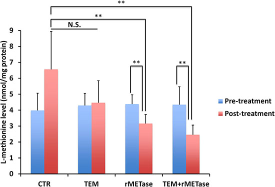 Post-treatment MET levels in tumors treated with rMETase alone (p = 0.0009) or in combination with TEM (p = 0.0006) were significantly decreased compared to the untreated control (Figure 2), suggesting the lowering of tumor MET levels by rMETase is the mechanism of inhibition.