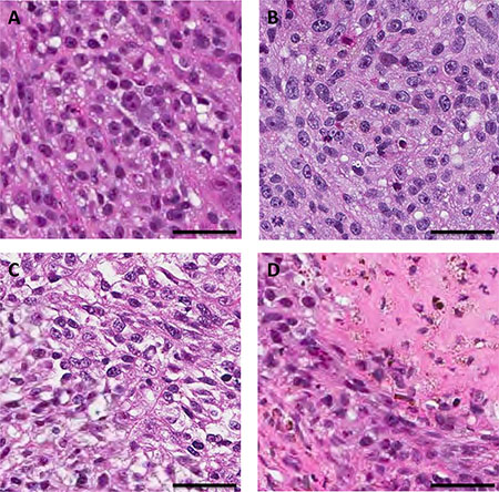Figure 4: Tumor histology. (A) Untreated control. (B) TEM treated. (C) rMETase treated. (D) TEM/rMETase treated. Scale bars: 50 μm.