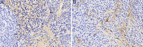 Figure 1: The expression of TGF-β (black arrow) in tumor stroma of Group NS (A) and Group I (