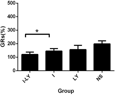 The tumor growth rate(TGR) of Group I-LY was significantly decreased compared with the other three groups (p = 0.00 < 0.05).