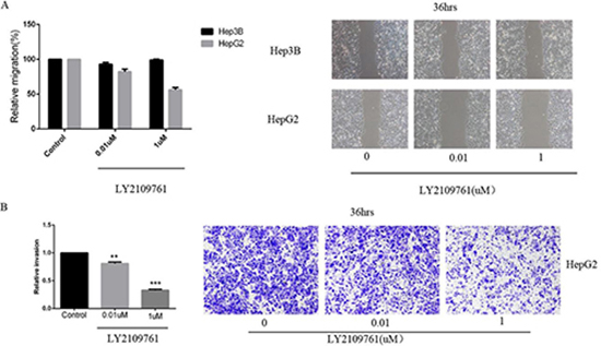 Figure 5: LY2109761 signifcantly suppressed both the tumor cell migration and invasion. (A) LY2109761 could inhibit the migration of HepG2 cells at a very low dose (0.01 uM). (B) Consistent with the result of wound-healing assay, the invasion property of HepG2 cells was greatly suppressed by LY2109761 at a very low dose of 0.01uM.