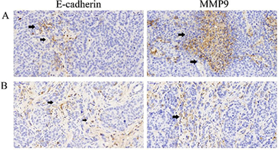 Figure 7: The expression of E-cadherin and MMP9. (A) the expression of E-cadherin(black arrow) and MMP9 (black arrow) in Group NS indicated that an overexpression of MMP9 was exsited in the tumor microenvironment of Hepatocarcinoma cells which implicated a metastatic property of the tumor cells; (B) the expression of E-cadherin and MMP9 in Group LY indicated that LY2109761 may play a role in down-regulating the expression of MMP9 while promoting the expression of E-cadherin.