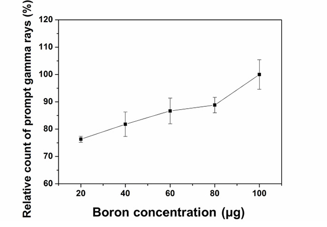 Figure 1 shows the relative prompt gamma ray counts based on the MCNPX simulation. This figure was normalized with a mean value of 100 μg at the maximum value. The number of counted prompt gamma ray events increased with increasing boron concentration. This means that a higher boron concentration causes a higher number of 719 keV prompt gamma rays to be generated by the proton boron fusion reaction.
