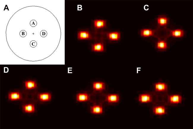 Figure 2: (A) Original pattern (axial view) of the virtual water phantom including the four boron uptake regions (BURs). This diagram indicates the location and geometric specifications of each BUR with the same diameter in the virtual water phantom. Prompt gamma ray images are shown in (B–F) at boron concentrations of (B) 20 μg, (C) 40 μg, (D) 60 μg, (E) 80 μg, and (F) 100 μg.